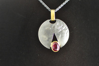 Granulated textured, blackened silver pendant with facetted garnet in 22ct gold |